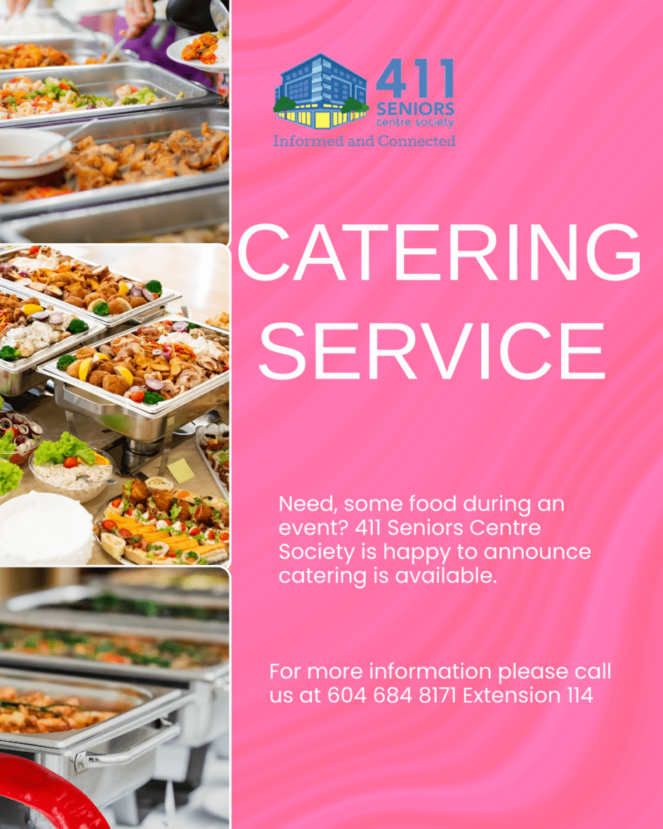 Planning an event? Let us take care of the food. 411 Seniors Centre Society now offers catering services for a variety of events, with fresh, delicious meals prepared on-site.