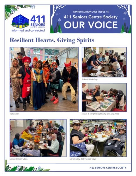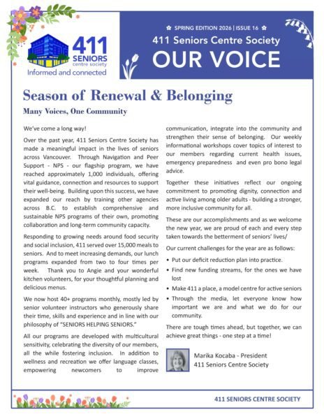 411 Seniors produces a monthly newsletter, created by members of 411. The newsletter provides monthly news updates on 411 activities, programs and events, and includes editorials, letters to the editor, membership profiles, critical information for the older adult community, stories, poems, recipes, and more!